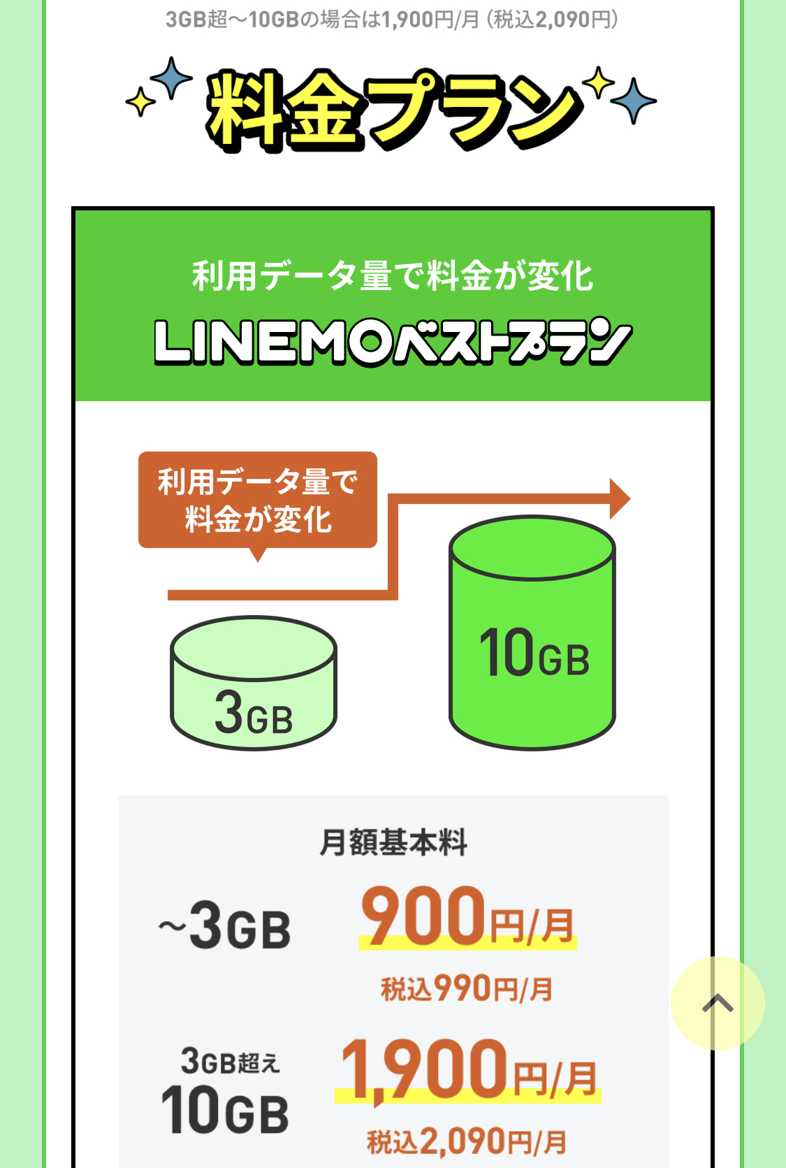 3GBのミニプランが月990円、20GBのスマホプランが月2728円、LINEはギガフリーなのでデータ消費なしで使えます。