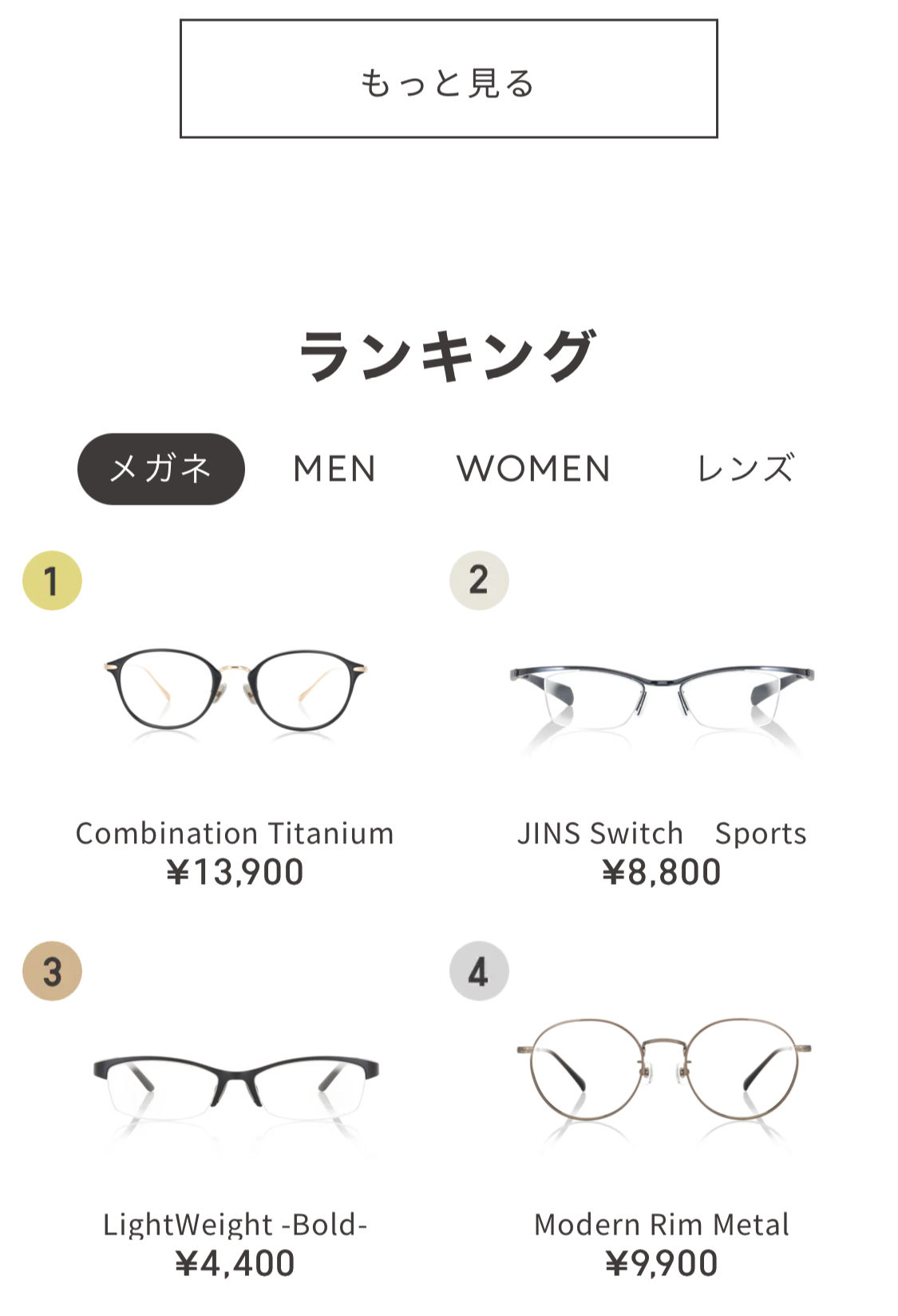 ・JINS=はレンズの屈折率が4段階で薄型のレンズが追加料金なしで選べます